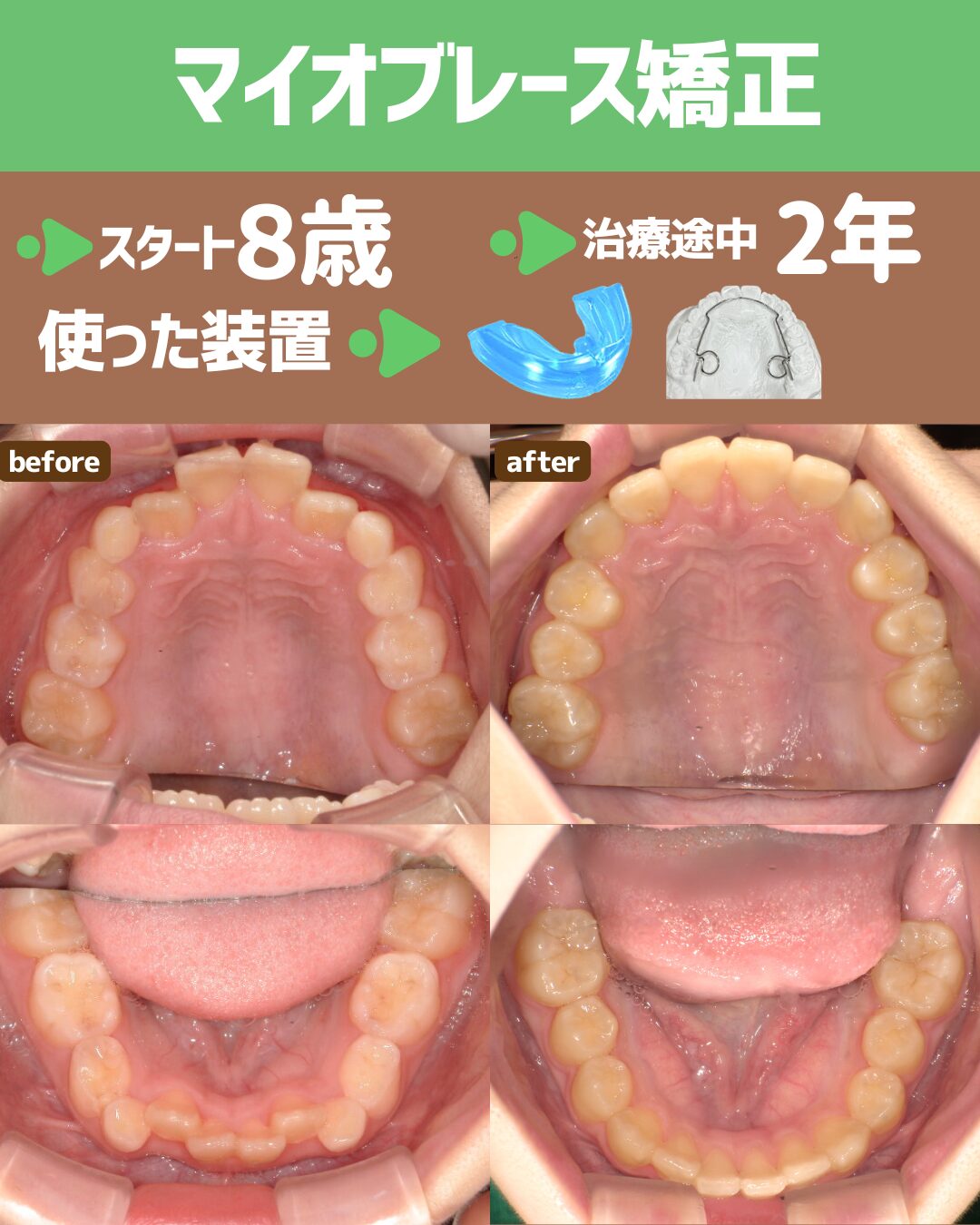 | 歯並びの改善 | マイオブレースとアクティビティにより、歯並びが悪くなってしまう原因となる口呼吸や舌の悪癖を改善し、歯並びを整えていきます。 |