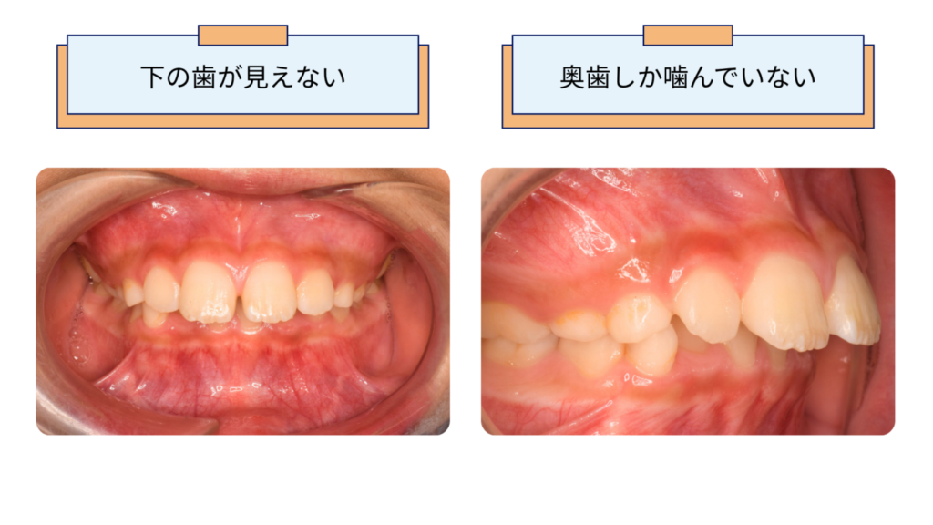 下の歯がほとんど見えず、噛み合わせが深い歯並びで、奥歯しか当たらないため、前歯で物を噛み切ることができない状態でした。