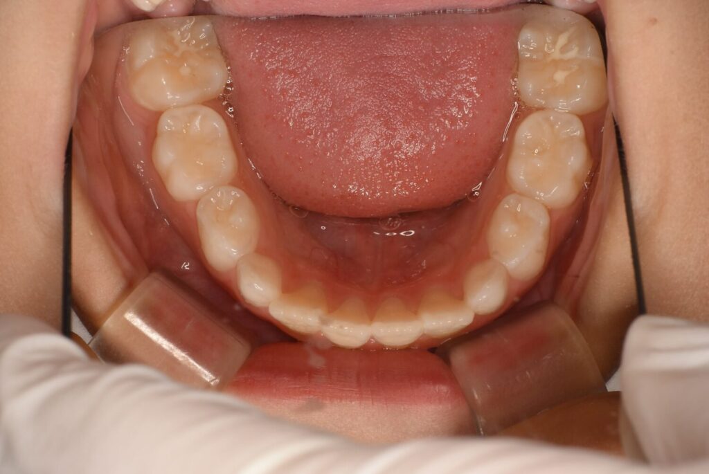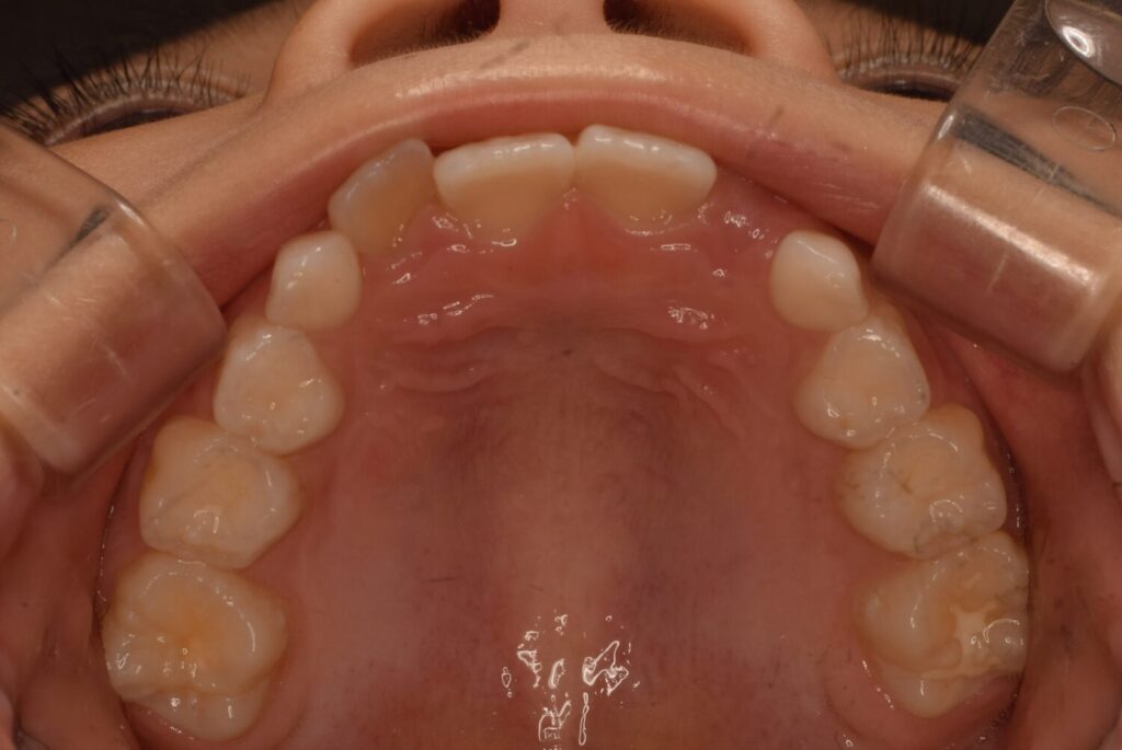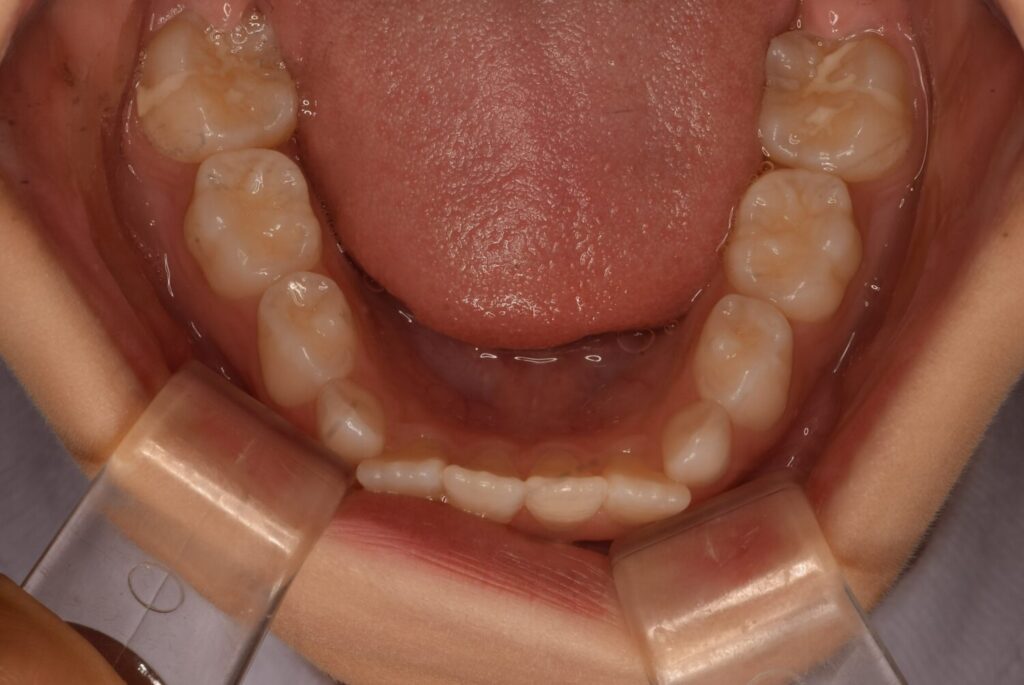 一番最初当院に来院されたきっかけは下の4本の歯が平坦に並んでいることと、上の2番目の生えてきている歯が唇の方から生えてきて入る場所がないことがきっかけでした。