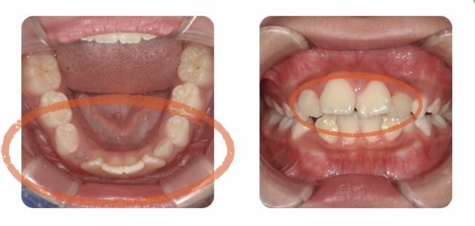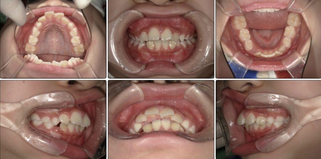 飲み込みの時にはかなり口唇に力を入れていて、下顎が後退し上顎はV字歯列になっていました。