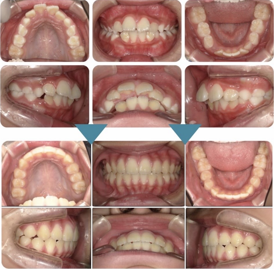 治療前後では下の歯のがたつきはなくなり、上の顎もU字歯列になり綺麗な噛み合わせが保たれています。
