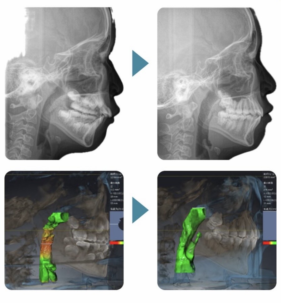 気道写真やレントゲン写真を比較してもしっかりと前方成長できていることがわかります。