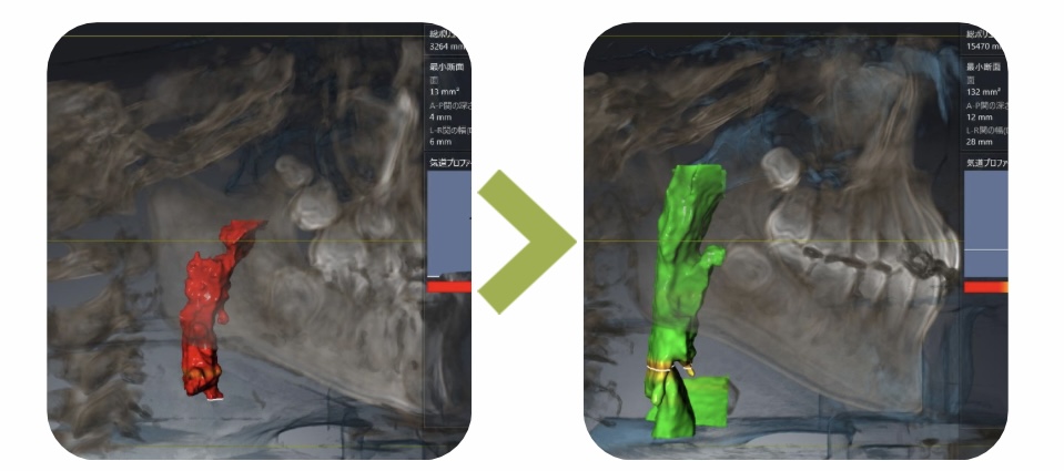 気道も治療前と終了時で比較するとしっかりと太くなっていました。